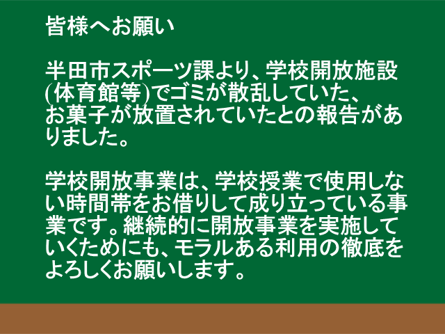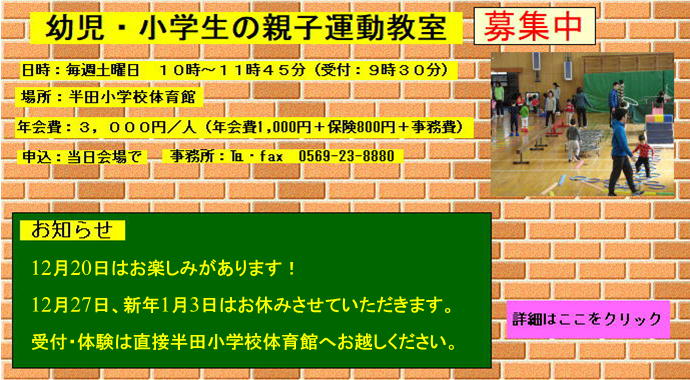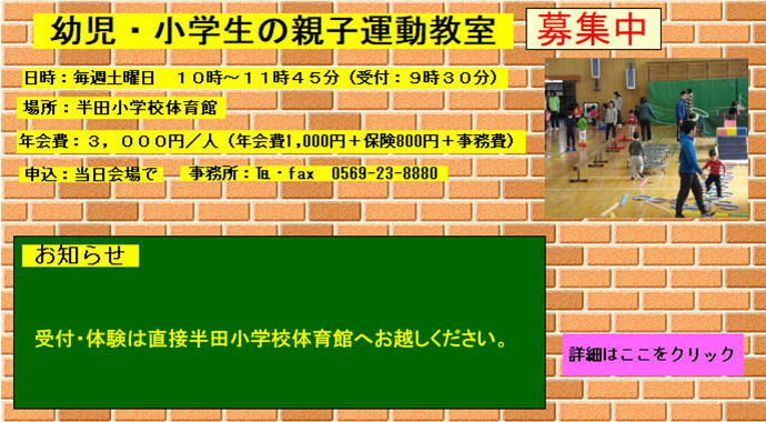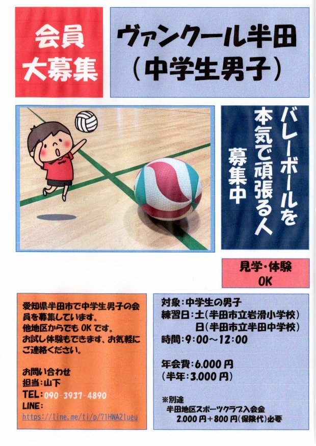 半田地区スポーツクラブは ● 平成15年2月、半田市で5番目の「総合型地域スポーツクラブ」として設立。 ● 半田中学校エリアで、半田中学校・半田小学校・岩滑小学校・雁宿小学校・さくら小学 校の体育施設の管理指導員として半田市から委嘱され管理しています。 ● 平成20年10月13日文部科学大臣から表彰されました。 小中学生向けチームの紹介 半田中学校 年間予定表 キッズ10月活動カレンダー ここをクリック Kids11月活動カレンダー ここをクリック 半田小学校 岩滑小学校 雁宿小学校 instagram さくら小学校 トップページへ